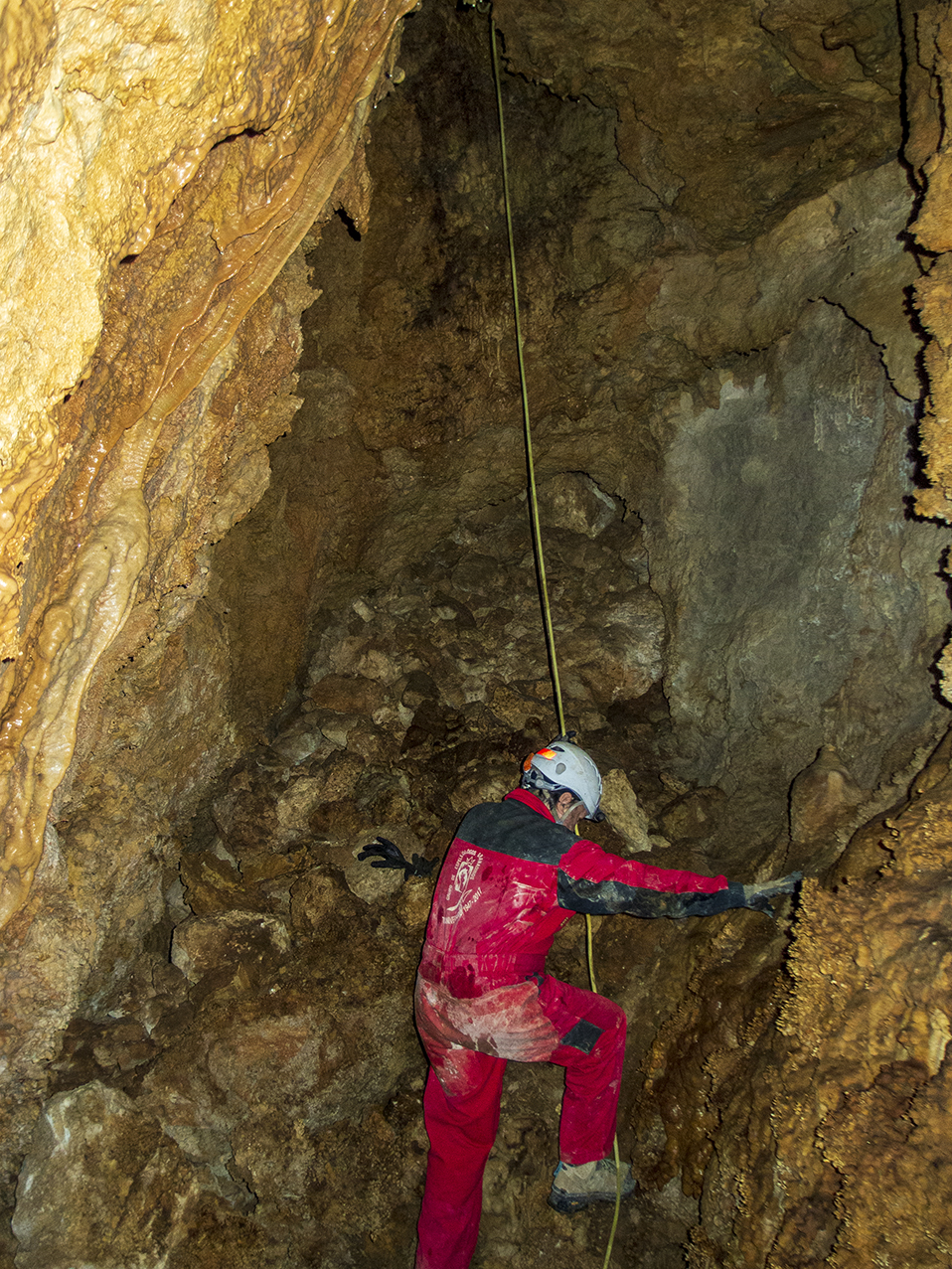 En esa ocasión se realizó la desobstrucción de dicho paso, pero no se llegó a descender por falta de material. Ahora provistos del material necesario, se acometió el forzar el paso para continuar con la exploración.